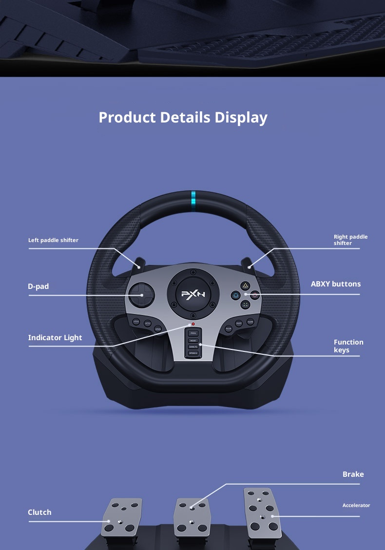 Packing List: steering wheel, manual, pedal, gear