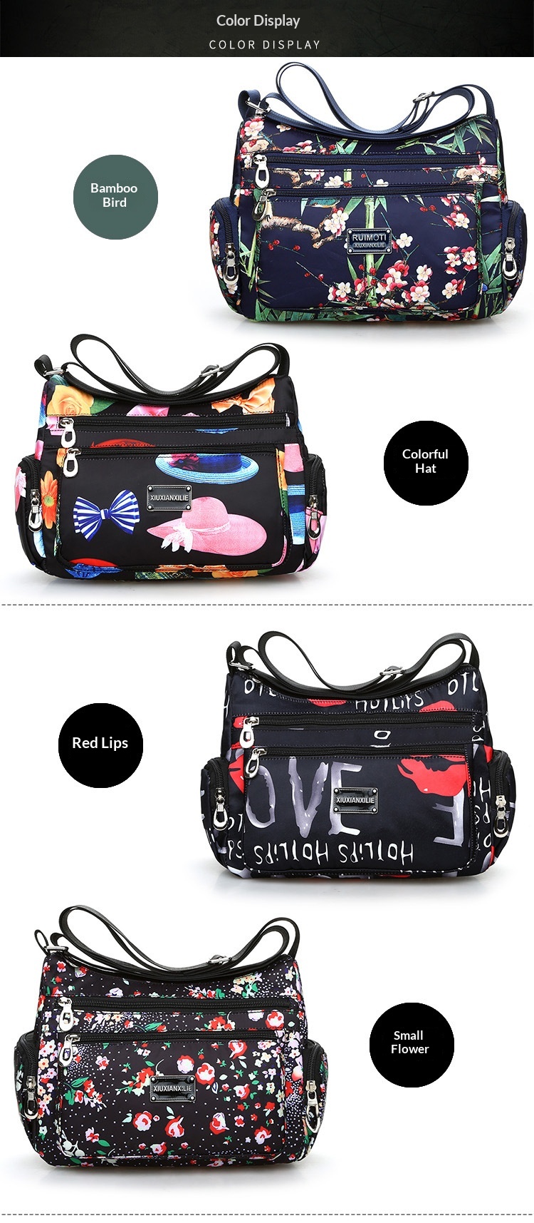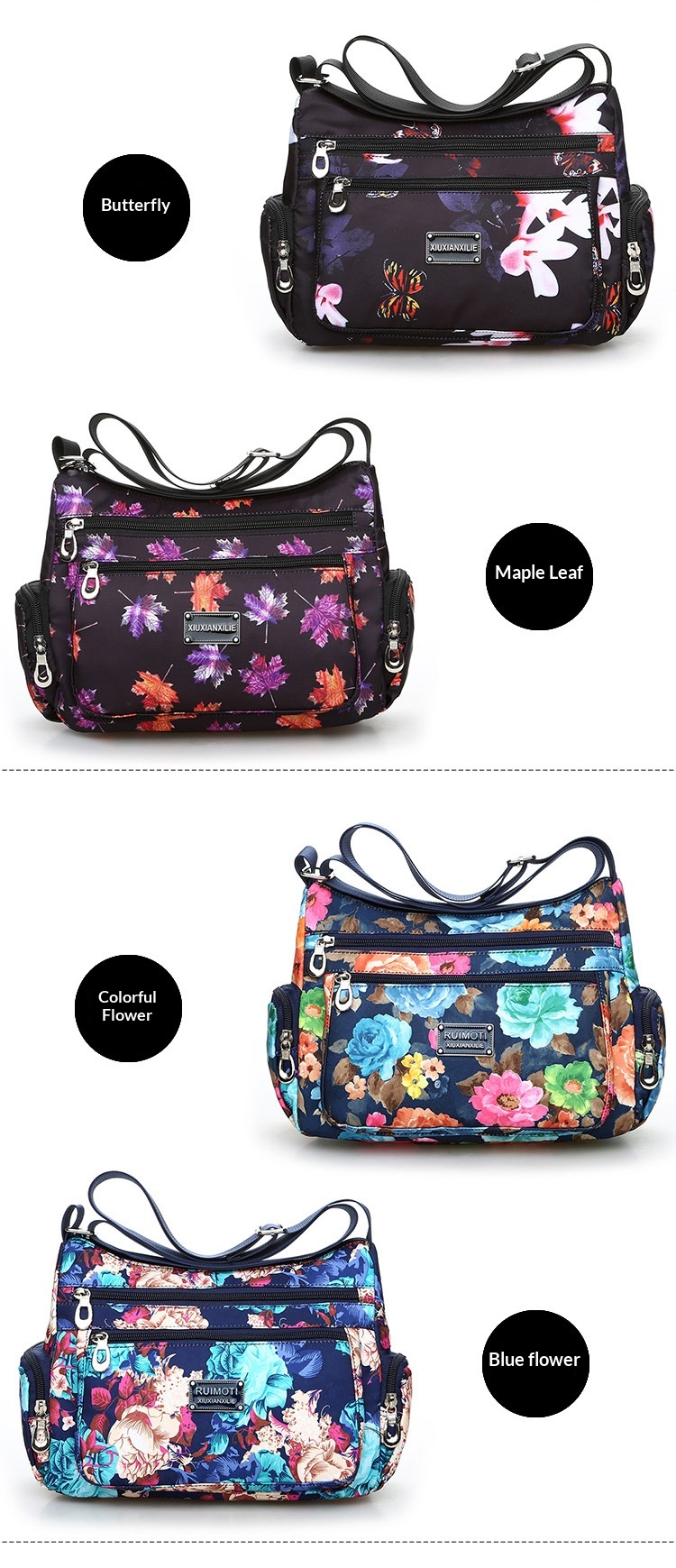 Colors: blue flowers, colorful flowers, maple leaves, butterflies, perfume, colorful umbrella, red flowers, white flowers, small flowers, red lips, colorful hat, bamboo and birds