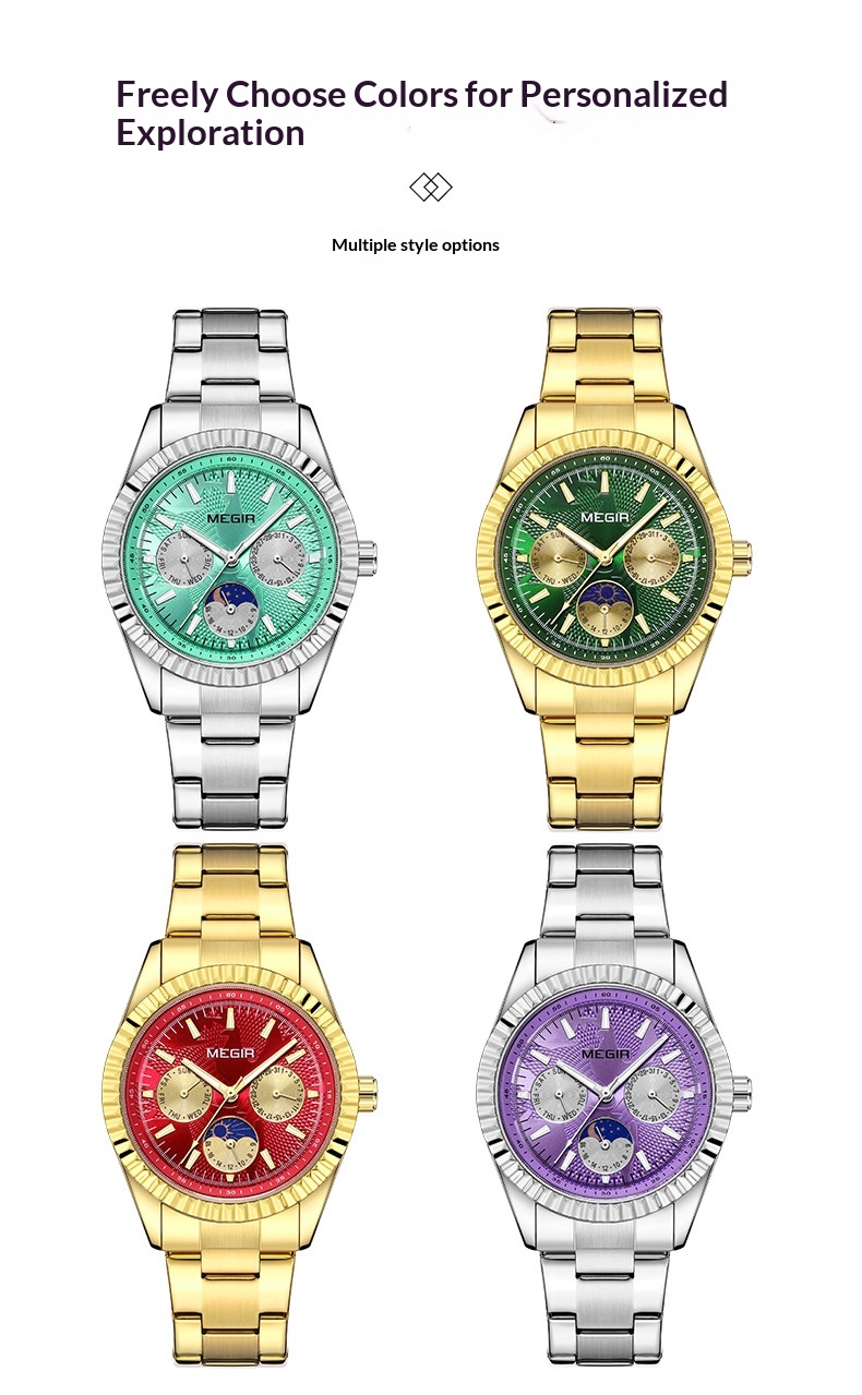 Colors: Steel Case with Light Blue Dial and White Accents, Steel Strap; Steel Case with Purple Dial and White Accents, Steel Strap; Gold Case with Green Dial and Gold Accents, Gold Steel Strap; Gold Case with Red Dial and Gold Accents, Gold Steel Strap